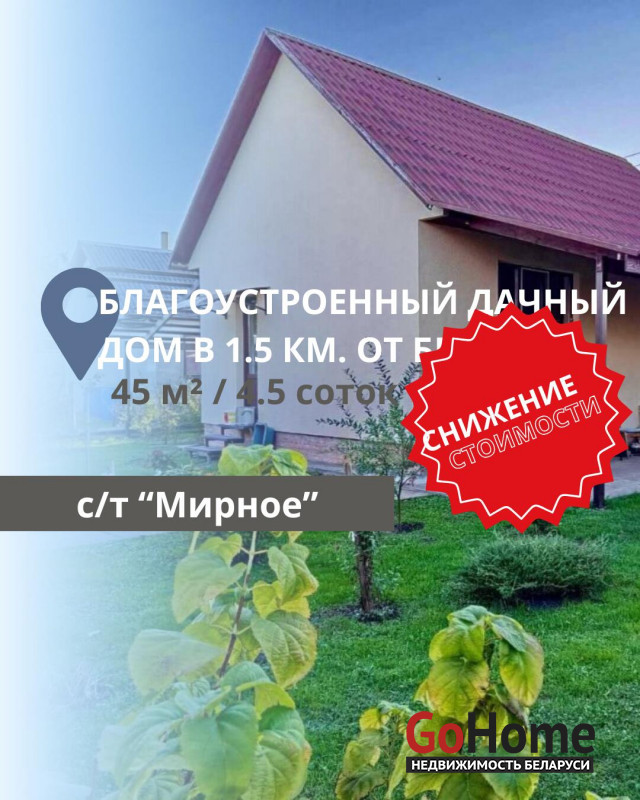 Дачный дом, расположенный всего в 1.5 км от Бреста в садовом товариществе "Мирное", был построен в 2020 году и предлагает комфортные условия для отдыха и проживания. Общая площадь составляет 45 м2, из которых жилая площадь — 31.4 м2. Внутри дома реализован современный дизайн с хорошим ремонтом: совмещенный санузел, кухня, объединенная с гостиной, создают уютную атмосферу. Стены выполнены из блоков, крыша покрыта мягкой кровлей, а дом утеплен, оштукатурен и окрашен. Окна ПВХ и металлическая входная дверь обеспечивают надежность и тепло. Внутри установлена система теплых полов, а также остаются встроенная кухня и шкаф в прихожей.