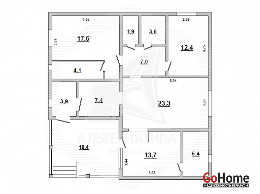 Дачный дом жилого типа в г.Бресте. 2004 г.п. 1 этаж. Общ.- 119,4 кв.м, 2 комнаты, высота потолка - 2,85 м.