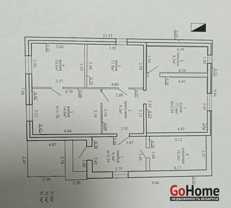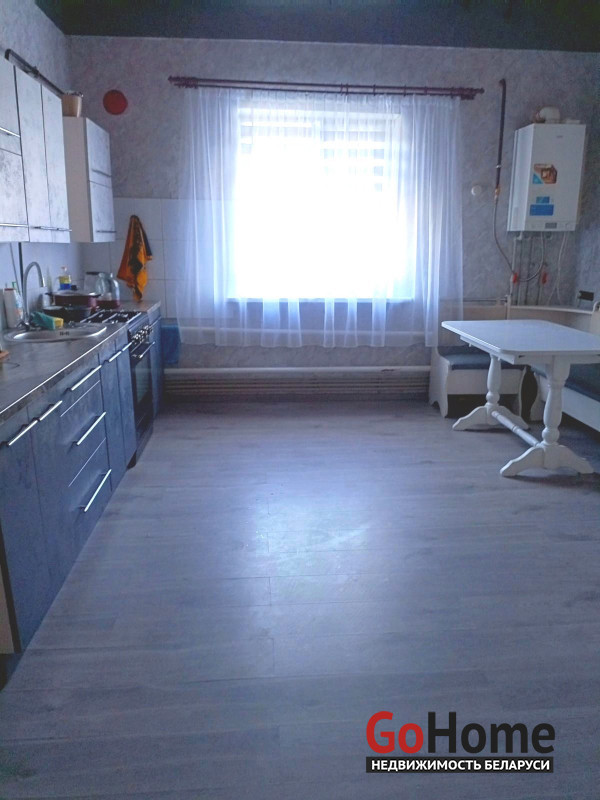 Общая площадь дома составляет 91,7 м², жилая площадь – 37,0 м², кухня – 17,6 м². Дом выполнен из бревен и облицован кирпичом, с пристроенными блоками, где расположены кухня, санузел, кладовая и тамбур. В доме выполнена полусухая стяжка пола и свежий косметический ремонт. В тамбуре выведено отопление, заменена входная дверь. Санузел совмещенный площадью 8,3 м² с полами с подогревом. Центральное водоснабжение, газовое отопление, окна ПВХ.