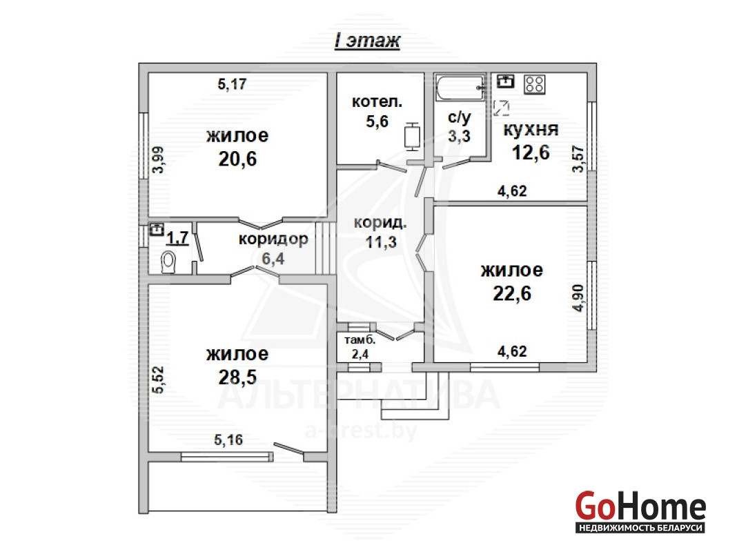 Квартира в блокированном жилом доме в г.Бресте. 1983 г.п. 2 этажа, цокольный этаж. Общ.СНБ - 174,7 кв.м, общ.- 112,6 кв.м, жил.- 71,7 кв.м, кух.- 12,6 кв.м. 3 комнаты, высота потолка - 2,90 м.