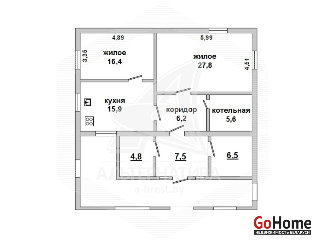 Квартира в блокированном жилом доме в Брестском р-не. 1958 г.п. 1 этаж. Общ.СНБ - 90,7 кв.м, общ.- 71,9 кв.м, жил.- 44,2 кв.м, кух.- 15,94 кв.м. 2 комнаты, высота потолка - 2,7 м.