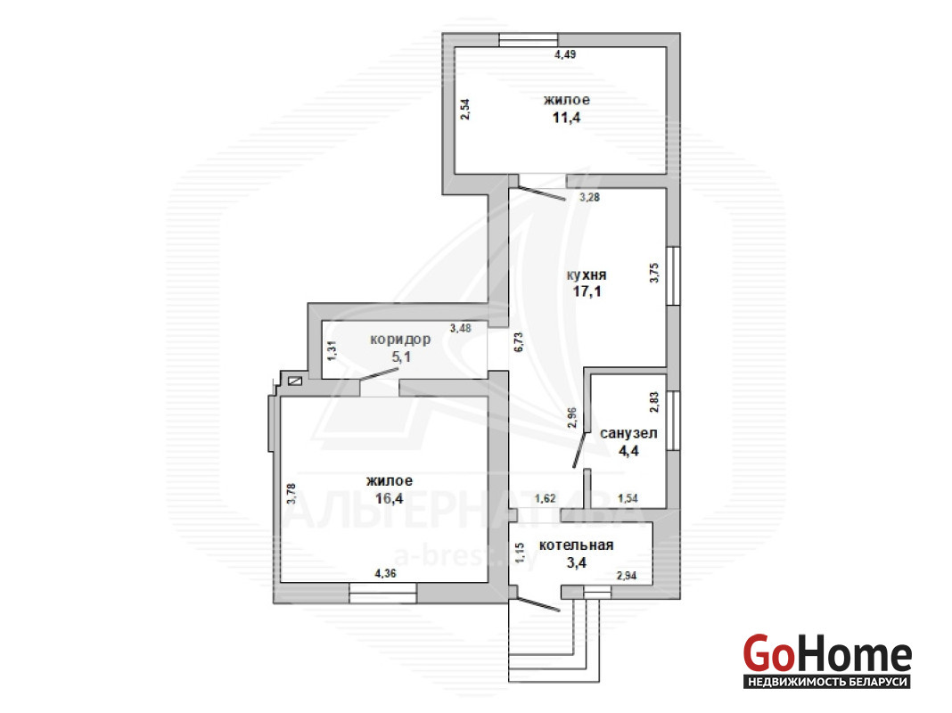 Квартира в блокированном жилом доме в г.Бресте. 1959 г.п. 1 этаж. Общ.СНБ - 57,8 кв.м, общ.- 57,8 кв.м, жил.- 27,8 кв.м, кух.- 17,1 кв.м. 2 комнаты, высота потолка - 2,74 м.