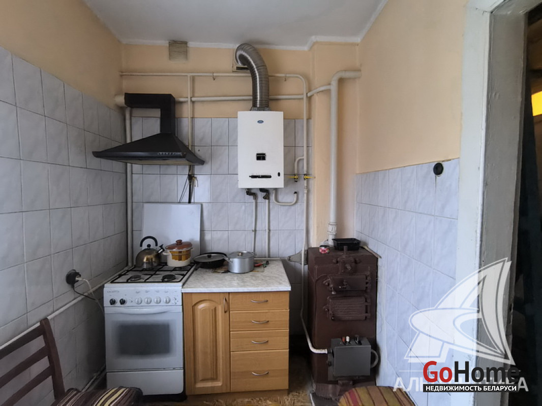 Коммуникации: отопление - газовый котел и твердотопливный, газ - централизованный (в доме), водоснабжение - централизованный водопровод, электричество - централизованное, канализация - централизованная.