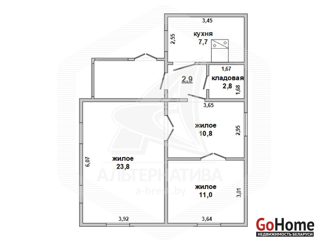 Жилой дом в Брестском р-не. 1976 г.п. 1 этаж. Общ.СНБ - 65,6 кв.м, общ.- 59,0 кв.м, жил.- 45,6 кв.м, кух.- 7,7 кв.м. 3 комнат, высота потолка - 2,80 м.