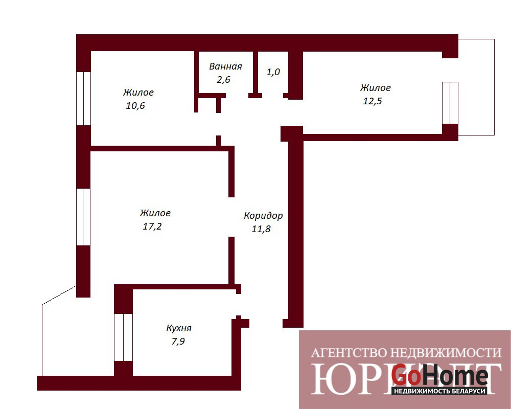 Площадь: общая 63,73 м2, жилая 40,33 м2, кухня 7,95 м2, кирпичный дом 1987 г. п.