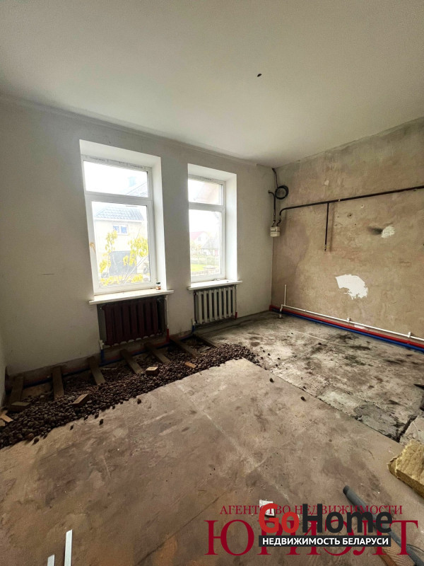 Окна на первом этаже – ПВХ, на втором – деревянные, полы на первом этаже – фанера + планируется ламинат, на втором – половая доска, в санузлах залита стяжка + теплый пол.