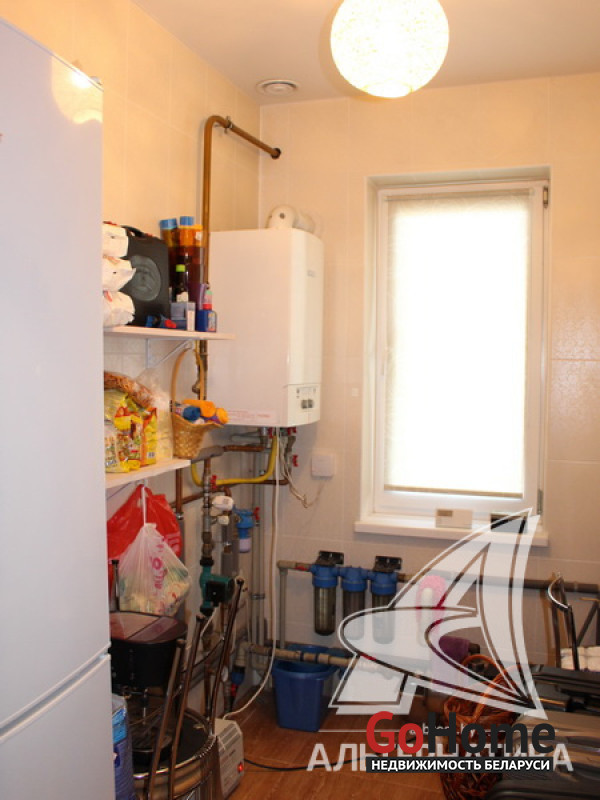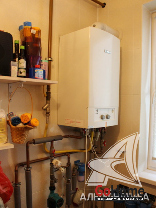 Коммуникации: отопление - газовый котел, газ - централизованный (в доме), водоснабжение - централизованный водопровод и скважина на участке, электричество - централизованное, канализация - автономная.