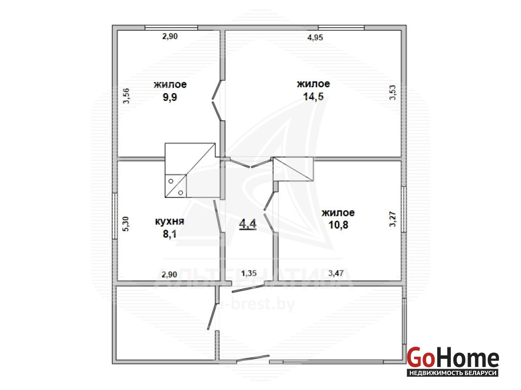 Жилой дом в Брестском р-не. 1969 г.п. 1 этаж. Общ.СНБ - 68,1 кв.м, общ.- 50,7 кв.м, жил.- 38,2 кв.м, кух.- 6,1 кв.м. 3 комнаты, высота потолка - 2,50 м.