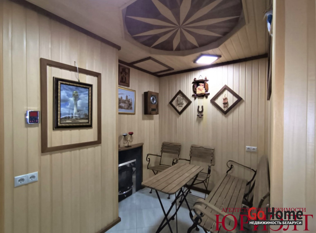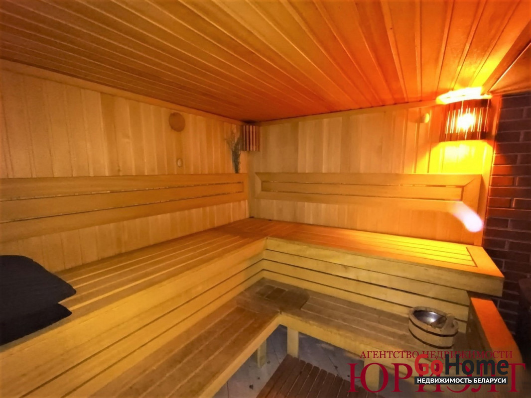 В доме шикарная баня - сауна: уложен теплый пол, плитка пр-во Польши. Комната отдыха отделана деревом, потолок с резным панно с использованием различных видов дерева.