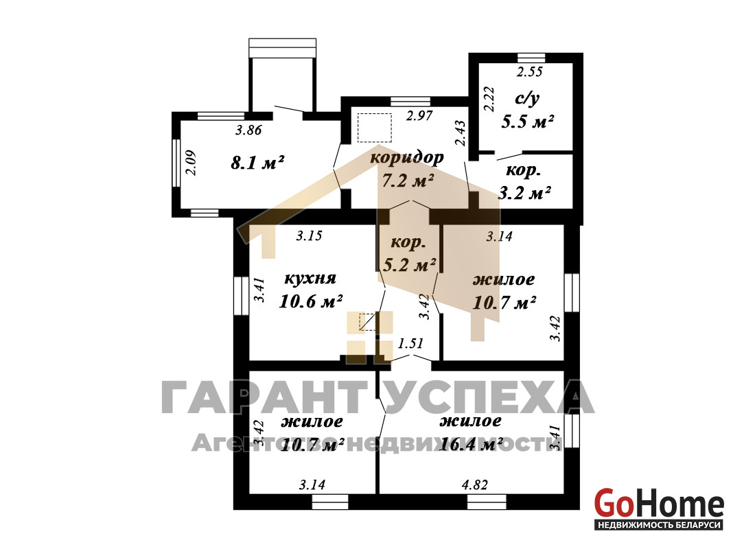 Стены здания выполнены из кирпича и оштукатурены, кровля – волновой шифер. В доме вставлены окна с профилем ПВХ.