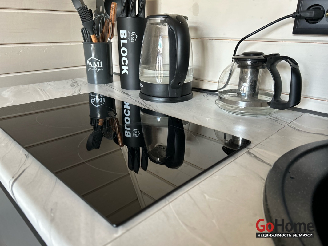 Кухня: Варочная индукционная панель, холодильник, печь, чайник, посуда.