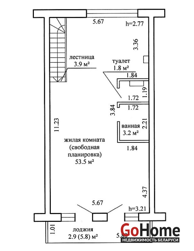 - просторная студия -53,5 м² (гостиная+кухня) с большими окнами и с выходом во двор.