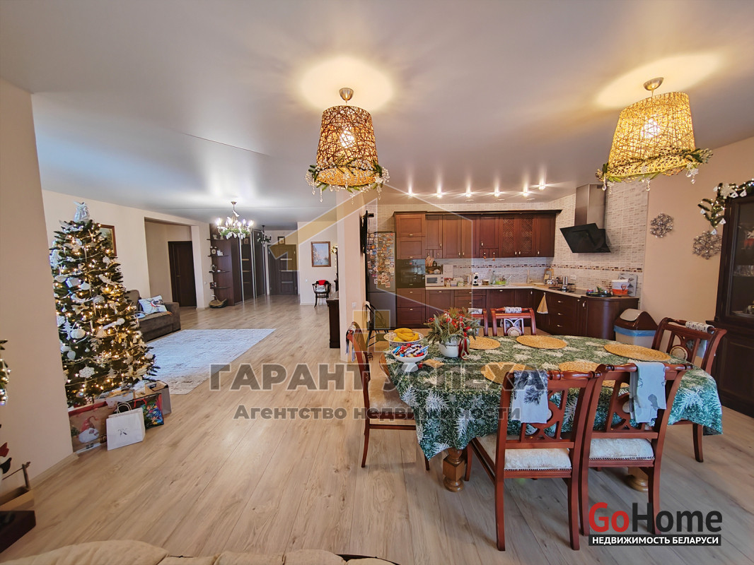 Общая площадь жилых помещений составляет 184,3 кв.м., жилая – 63,6 кв.м. Этот дом станет идеальным вариантом не только для проживания большой семьи, но и для гостеприимных хозяев, которые любят принимать дружеские компании. Сердцем этого дома является большая эркерная кухня-столовая с огромным холлом, площадь которых превышает 80 кв.м. Из кухни есть выход на большую крытую террасу размером 6х7 метров. В дубовую кухонную мебель вмонтирована техника от немецкого производителя Bosch. Также в доме имеются 4 жилые комнаты, 2 совмещённых узла, топочная, ряд вспомогательных помещений, встроенный гараж площадью почти 45 кв.м на два автомобиля с автоматическими воротами и прямым входом в дом. Но если этого Вам покажется недостаточно, то на мансардном этаже Вас порадует ещё 220 кв.м площади трёхметровой высоты.