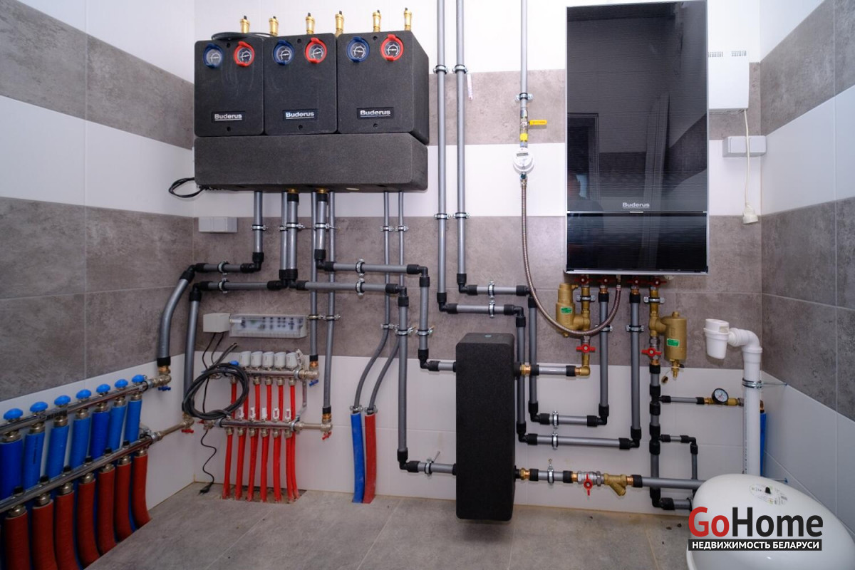 - Отопление и горячее водоснабжение реализовано за счет газового котла и бойлера косвенного нагрева BUDERUS с возможностью удаленного управления. В жилых комнатах и помещениях цокольного этажа установлены наружные радиаторы Kermi; в кухне, санузлах, топочной и коридорах уложены теплые полы REHAU.