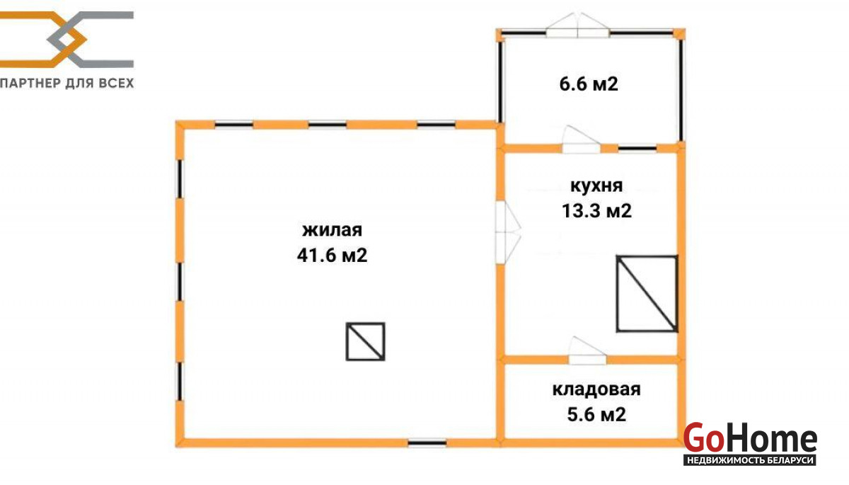 Общая площадь дома по СНБ 67,1 м2, состоит одной большой жилой комнаты 41,6 м2, кухни 13,3 м2, коридора, кладовой и летней веранды. Высота потолков 2,7 м.