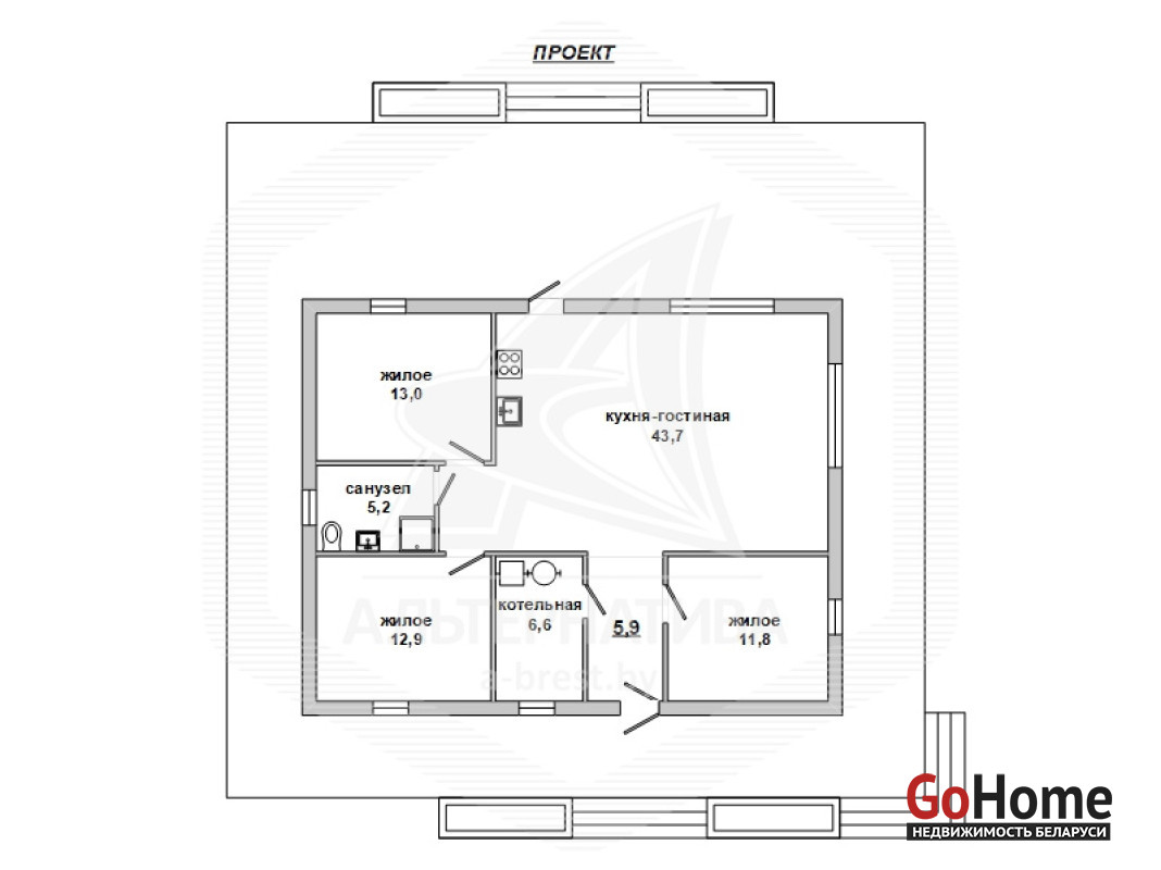 Коробка жилого дома в г.Бресте. 1 этаж. Общ.СНБ - 99,1 кв.м, общ.- 99,1 кв.м, жил.- 81,1 кв.м, кух.~ 10,0 кв.м. 4 комнаты.