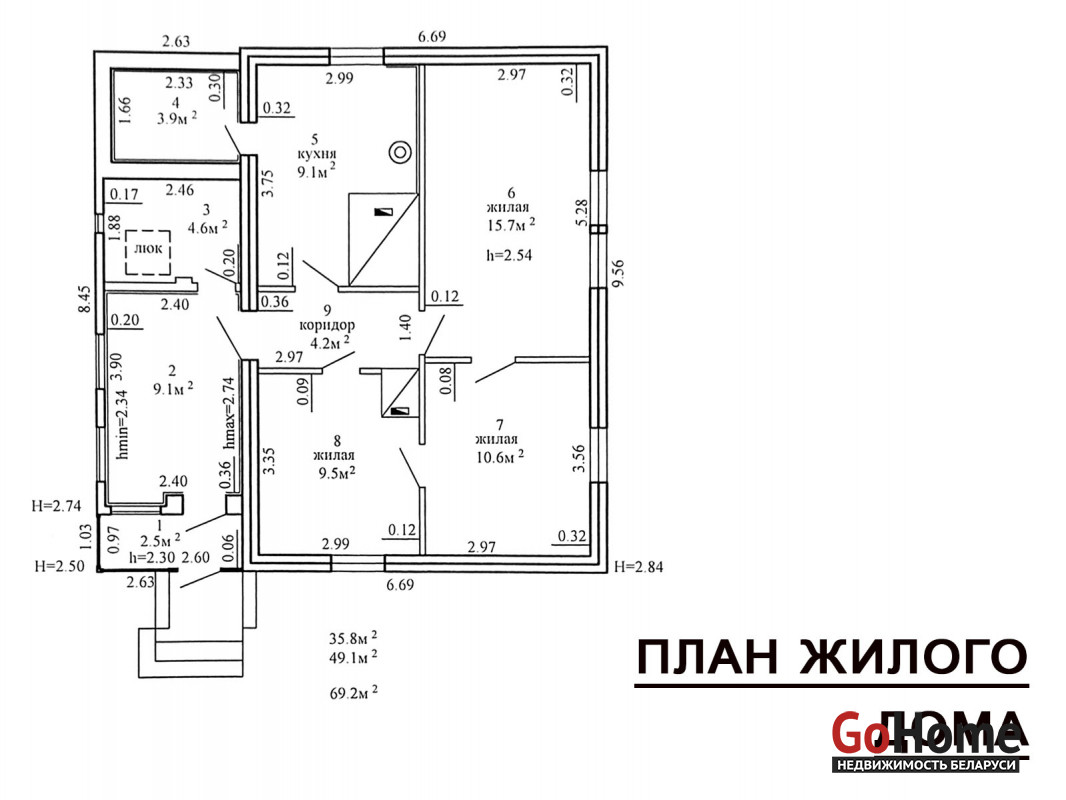 • площадь общая здания: 69,2 м²; площадь общая жилых помещений: 49,1 м²; площадь жилая: 35,8 м²;