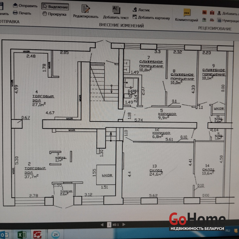 Готовая планировка под торговый зал и подсобные помещения (сан.узел, кабинет, 7 складских/подсобных помещений)