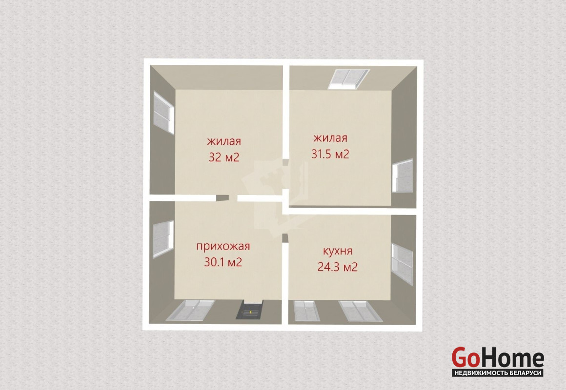Внутреннее пространство дома разделено на 4 помещения: прихожая (30.1 кв.м.), две жилые комнаты (32.0 кв.м. и 31.5 кв.м) и кухня (24.3 кв.м.). Большая площадь помещений позволит Вам воплотить любые идеи и задумки при организации вашего будущего жилья.