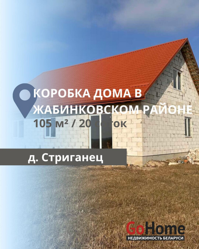Коробка жилого дома мансардного типа в д. Стриганец. Площадь первого этажа 105 м кв. Первый этаж состоит из 3-х жилых комнат, просторной кухни-гостиной, раздельного санузла, котельной. На мансардном этаже можно разместить 3 жилые комнаты. Проектом предусмотрена терраса с выходом из гостиной во внутренний дворик. Стены из газосиликатых блоков, кровля - металлочерепица, установлены окна ПВХ, по всему первому этажу залита черновая стяжка. Коммуникации: электричество на участке, газ проходит по улице, водоснабжение - пробита скважина, канализация - местная. Расстояние до Бреста - 18 км, подъездные пути асфальтированные. Участок прямоугольной формы 0,2 га.