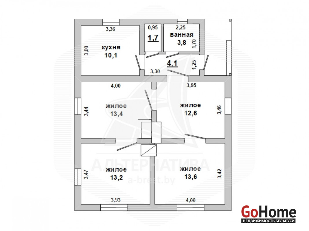 Жилой дом в г.Бресте. 1 этаж. Общ.СНБ - 72,4 кв.м, общ.- 72,4 кв.м, жил.- 52,08 кв.м, кух.- 10,08 кв.м. 4 комнаты, высота потолка - 2,60 м.