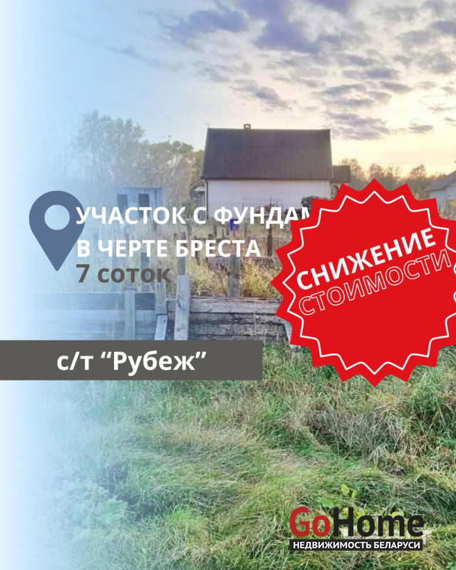 Продается участок в черте Бреста, расположенный в садовом товариществе Рубеж, площадью 7 соток. На участке имеется газ по улице, электричество подключено, а для водоснабжения используется скважина. Также на участке заложен фундамент под дом размером 8х10 метров и фундамент под хозяйственную постройку размером 2х3 метра. Это отличное предложение для строительства собственного дома и организации комфортного загородного отдыха.