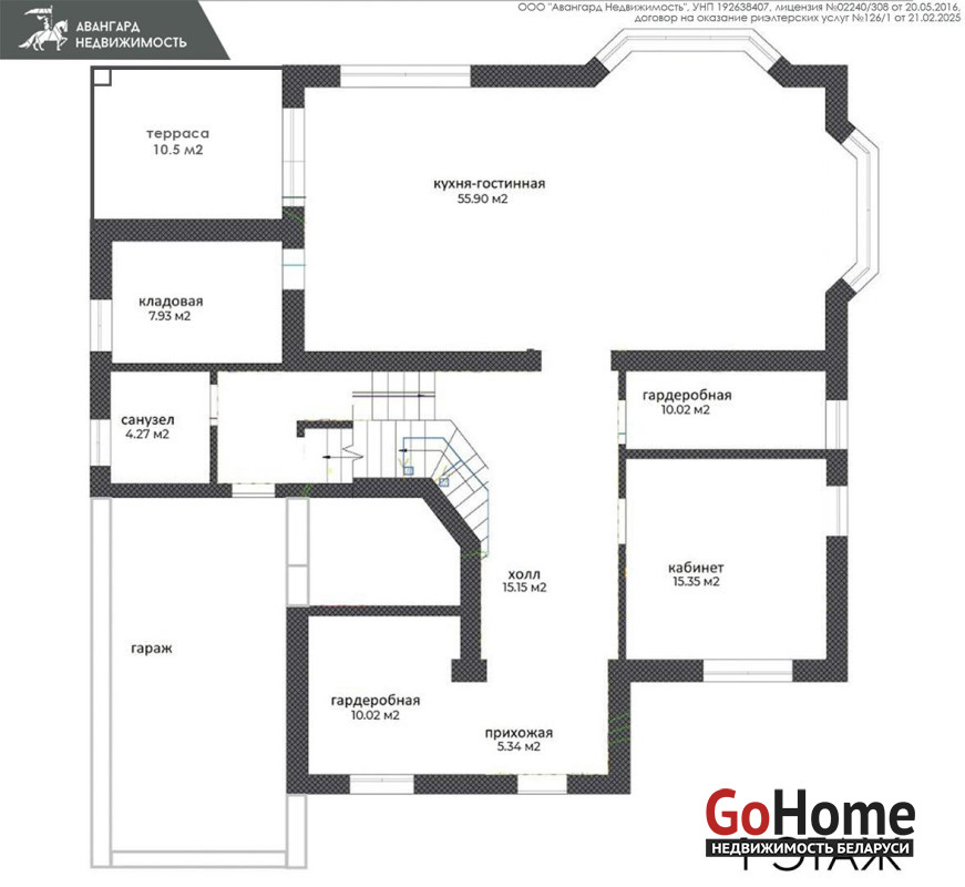 Первый этаж. Просторная гостиная с кухней и панорамными окнами, что обеспечивает поступление большого количества естественного света и визуальное увеличение пространства. Из кухни выход на террасу, отдельная кладовая для хранения. Гардеробная, санузел, кабинет, холл и прихожая.