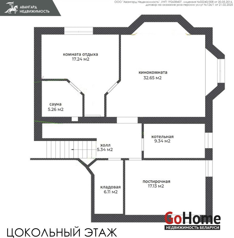 Цоколь. Предусмотрена зона отдыха с баней, отдельный большой кинозал, постирочная, котельная, комната для хранения.