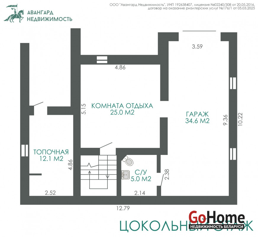 Цокольный этаж: гараж, оборудованный под тренажерный зал 34.6 м2, комната отдыха, санузел и топочная (отдельный вход с улицы).
