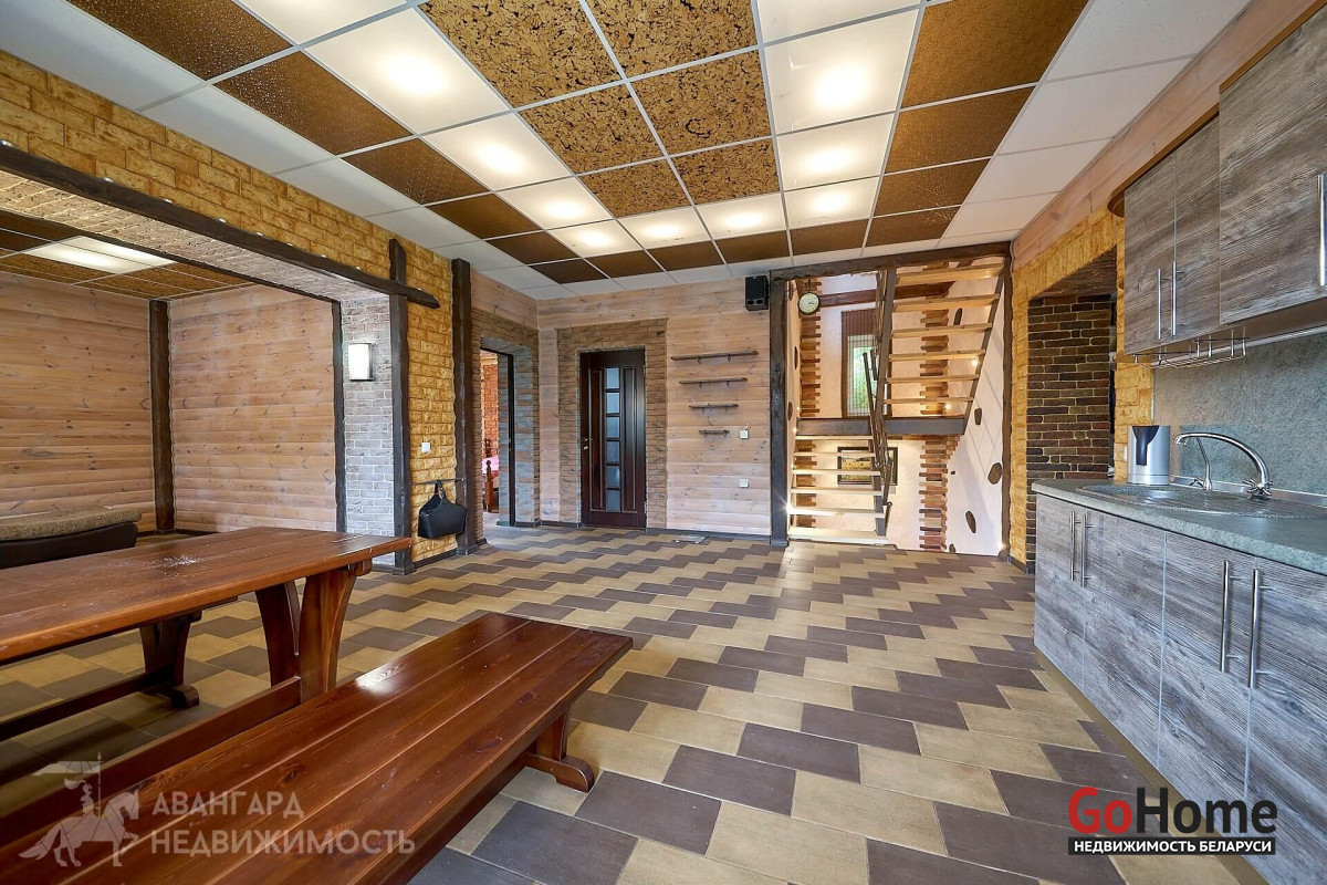 Общая площадь по СНБ - 255.9 м2. Внешние стены кирпичные утеплены пенопластом 5 см и обшиты сайдингом. Внутренние стены – газосиликатные блоки, обшиты блок-хаусом, декоративный кирпич. Перекрытия – железобетонные. Крыша – ондулин. Потолки армстронг. Полы – плитка, ламинат. Все окна – ПВХ стеклопакеты. Межкомнатные двери – массив. Встроенная кухня оборудована электрической варочной поверхностью, вытяжкой, установлен фильтр для воды. Санузлы в плитке. Сантехника в рабочем состоянии.
