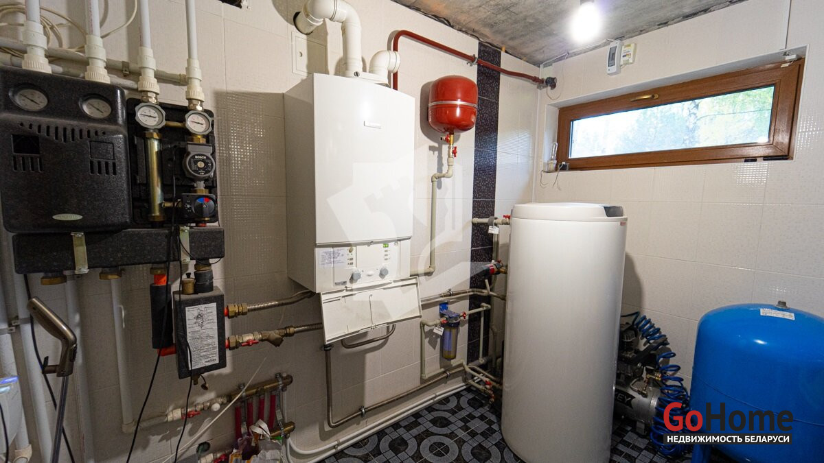 В доме площадью 279.5 м2 есть все необходимые коммуникации, которые обеспечивают комфортное проживание круглый год: отопление на газу, теплые полы в кухонной зоне и в гостиной. Водоснабжение индивидуальное - скважина, которая обеспечивает чистейшей водой круглый год. Канализация индивидуальная (биостанция). Материал стен – газосиликатный блок (стены утеплены и оштукатурены). Крыша –черепица.