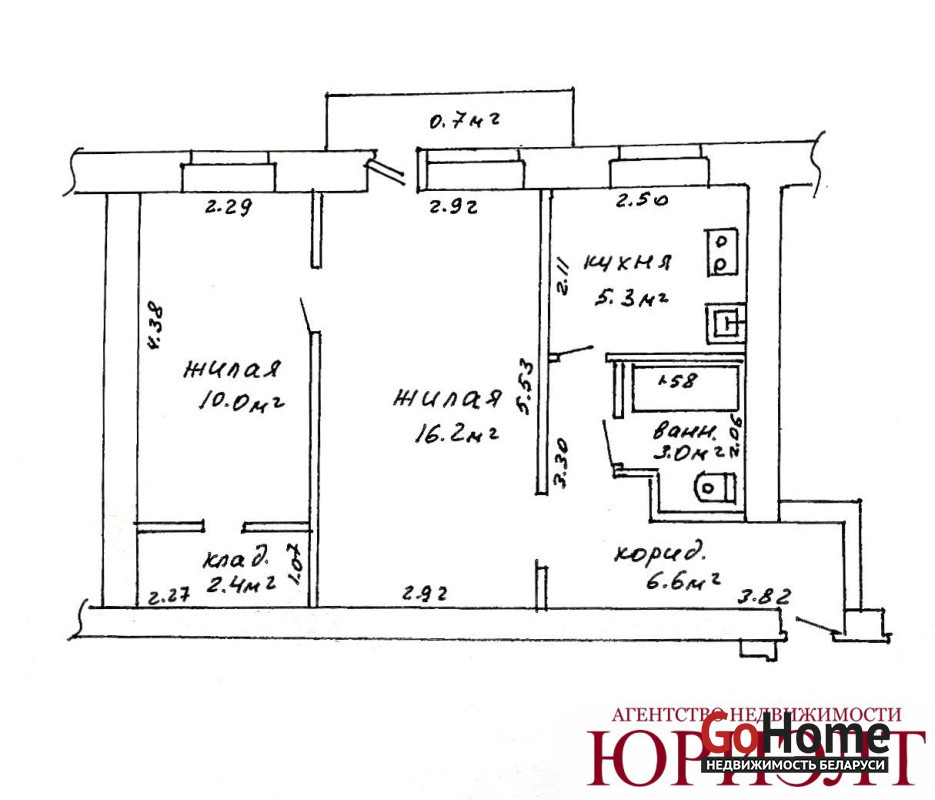 Общая площадь по СНБ – 44,2 м², жилая – 26,2 м², кухня – 5,3 м².