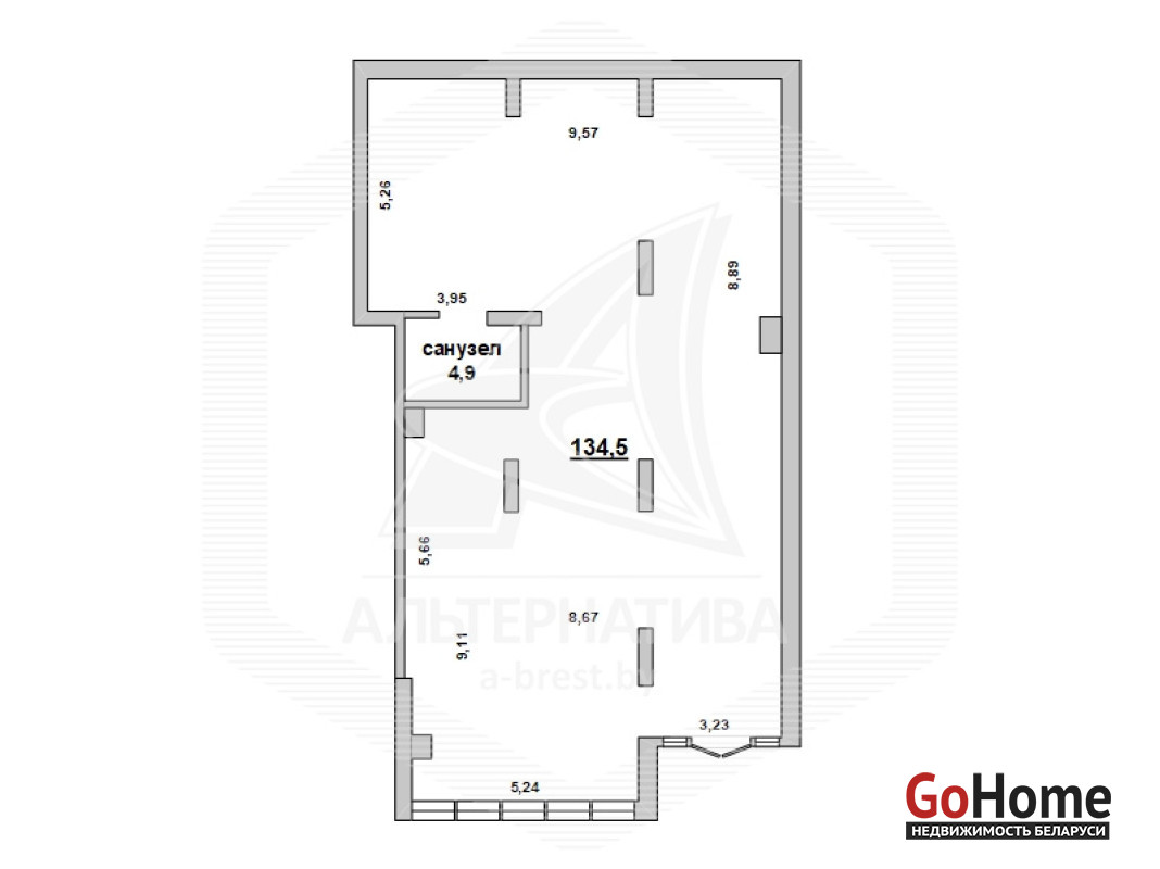 Торговое помещение в аренду в микрорайоне Ковалево (р - н ул. Октябрьской Революции и гребного канала) города Бреста общей площадью 139,4 кв.м. Изолированное помещение с отдельным входом расположено на 1 (первом) этаже жилого дома 2025 года постройки. Без внутренней отделки. Зал площадью 134,5 кв.м, отдельный санузел (4,9 кв.м). Высота потолков - 4,06 м. Установлена пожарная сигнализация, индивидуальные приборы учета электричества, водоснабжения и тепла, бойлер на горячую воду. Парковка. Цена указана с НДС. Рассматриваются все варианты. Лот - 250016A