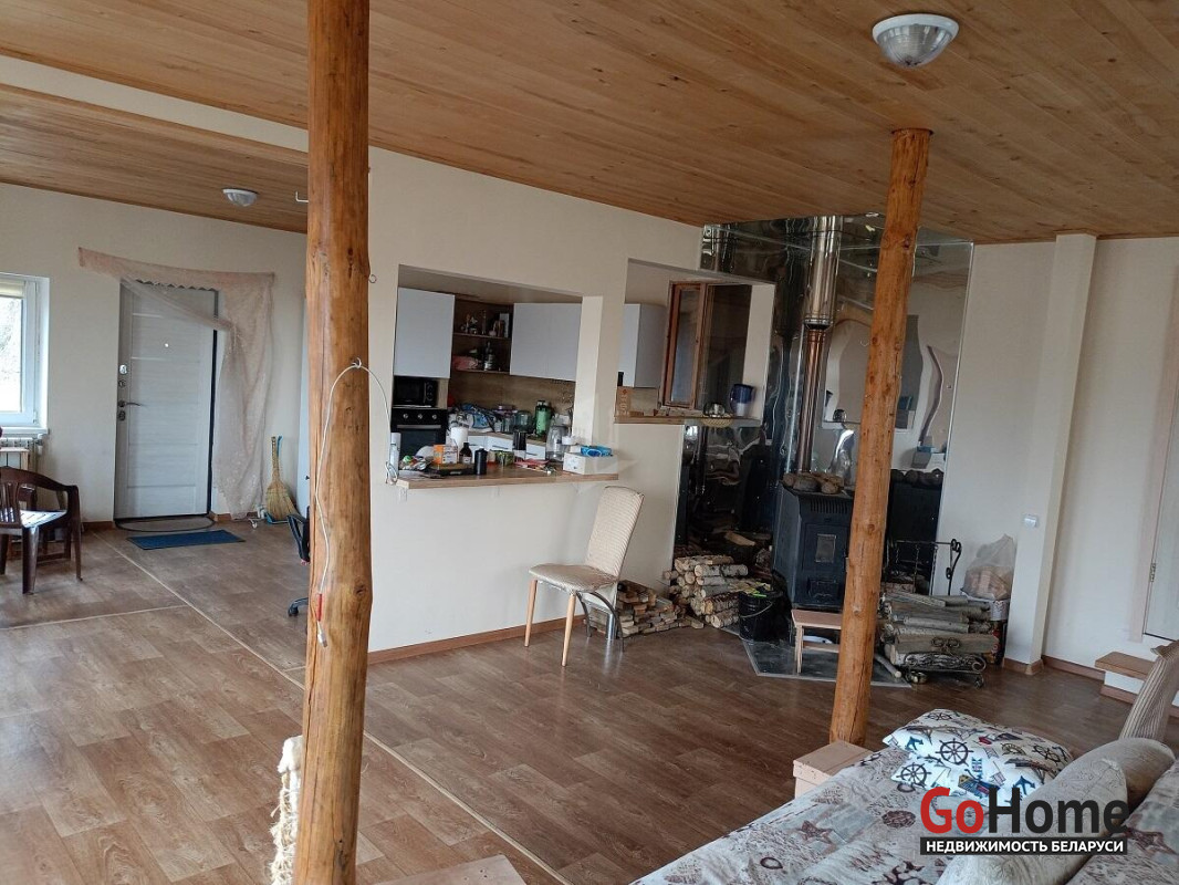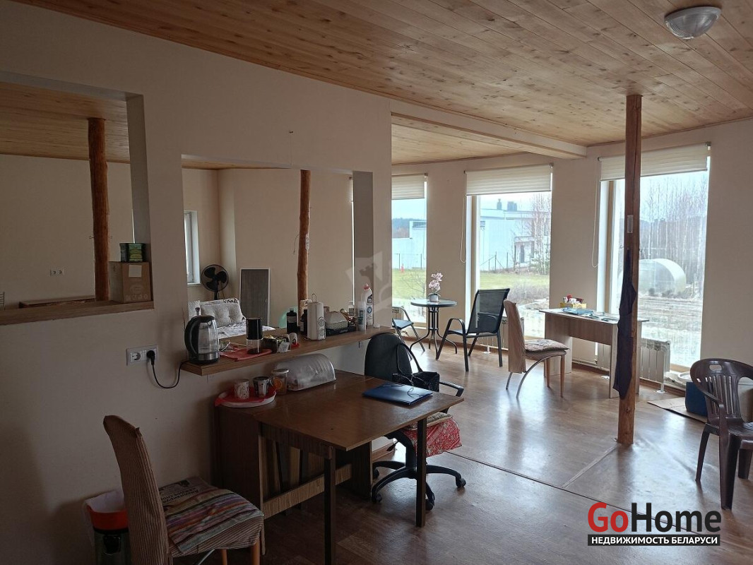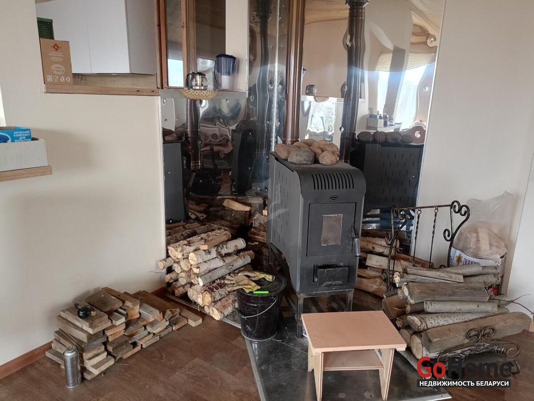 · просторная (58 м2) кухня-гостиная с панорамным остеклением, с современной печью на дровах, большой зоной столовой с полностью оборудованной (холодильник, печь СВЧ, духовой шкаф, варочная панель) кухней с множеством мест хранения и обеденным столом. Из кухни-гостиной есть отдельный выход на участок.