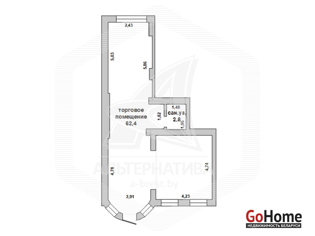 Торговое помещение в собственность в центре города Бреста (р - н колхозного рынка) общей площадью 65,2 кв.м. Изолированное помещение с отдельным входом расположено на 1 (первом) этаже жилого дома. Высокий пешеходный трафик. Торговый зал площадью 62,4 кв.м, отдельный санузел (2,8 кв.м). Высота потолков - 3,62 м. Технические характеристики помещения: полы - плитка, стены оштукатурены, окрашены, окна, двери - ПВХ. Установлены индивидуальные приборы учета электроэнергии и водоснабжения, пожарная сигнализация. Цена указана с НДС. В настоящий момент помещение сдано в аренду под общепит и приносит стабильный доход. Лот - 250617