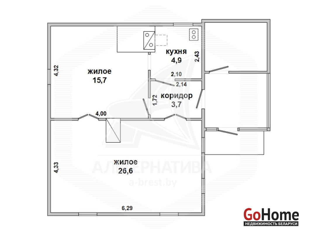 Жилой дом в Малоритском р-не. 1945 г.п. 1 этаж. Общ.СНБ - 50,9 кв.м, общ.- 50,9 кв.м, жил.- 42,3 кв.м, кух.- 4,9 кв.м. 2 комнаты, высота потолка - 2,45 м.
