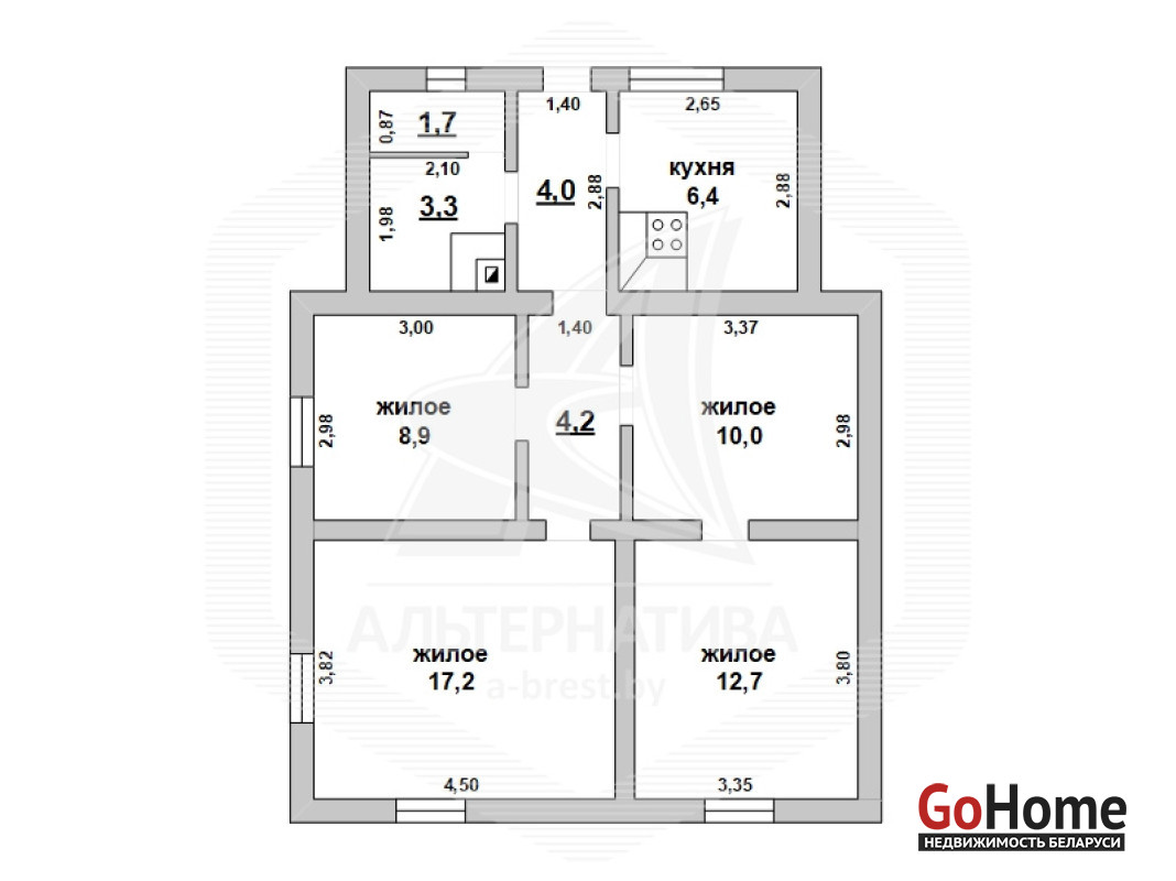 Жилой дом в г. Кобрине. 1 этаж. Общ.СНБ - 68,6 кв.м, общ.- 68,6 кв.м, жил.- 48,9 кв.м, кух.- 6,44 кв.м. 4 комнаты, высота потолка - 2,70 м.