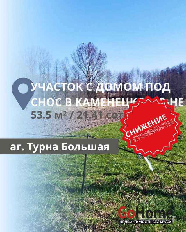 Продается участок с домом под снос в агрогородке Турна Большая, Каменецкий район. Общая площадь дома составляет 53,5 м2, а площадь участка — 21,41 сотки, дополнительно имеется 11,76 соток ЛПХ. На участке расположена блочная хозяйственная постройка размером 10x20 м, использовавшаяся для разведения животных, а также сухой погреб площадью 5x5 м. Коммуникации: газ — по улице, электричество — 380 Вт, вода — скважина. Участок отличается хорошим сообщением с Брестом, а также имеет развитую инфраструктуру в агрогородке.