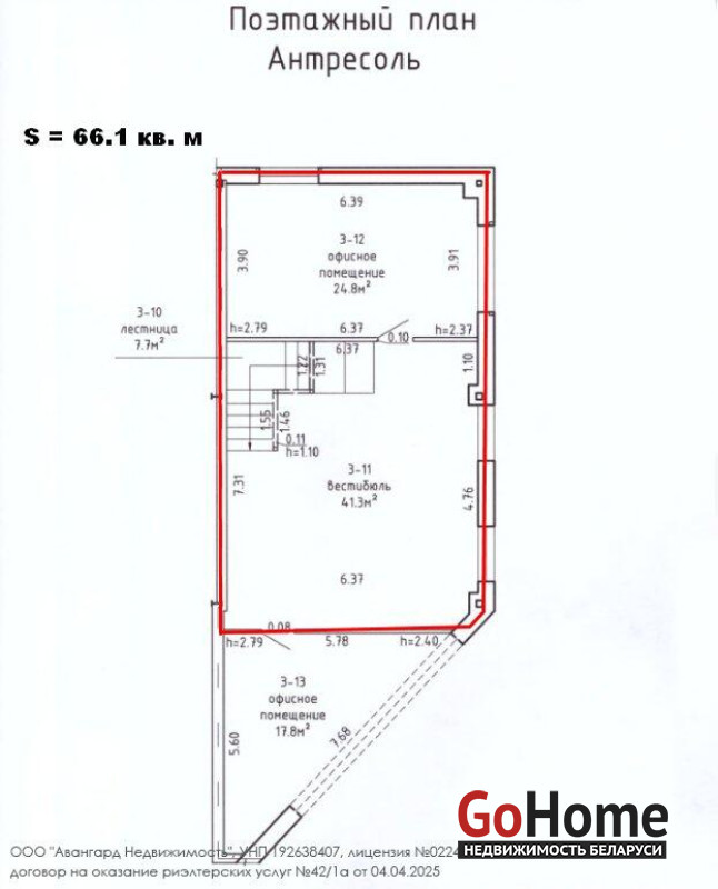 основной зал - 41.3 кв. м; кабинет - 24.8 кв. м. Месторасположение: