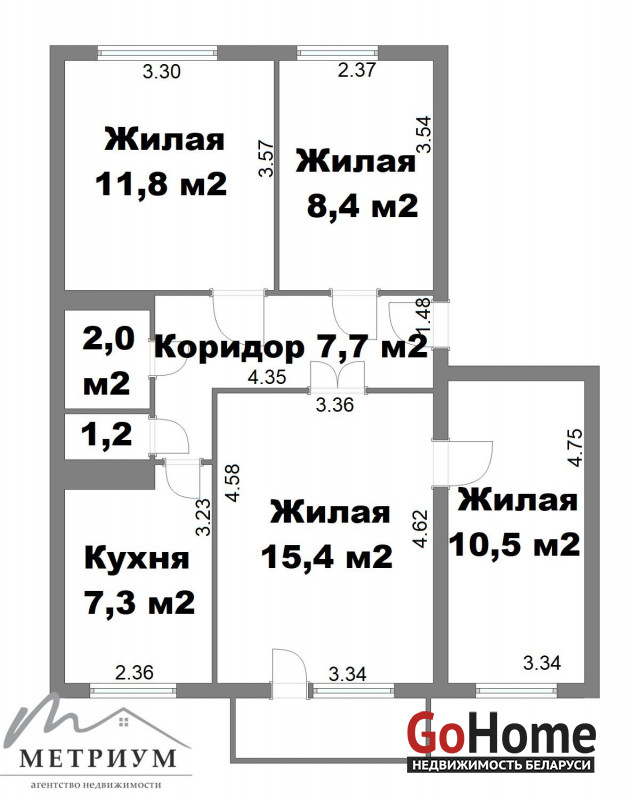 - три изолированные комнаты 11.8, 8,4 и 10,5м2 и одна проходная 15,4м2