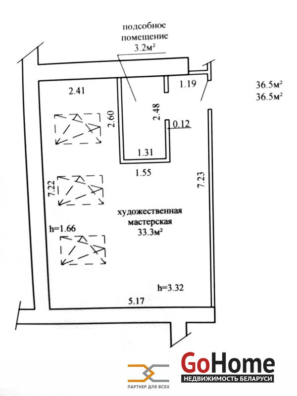 Помещение площадью 36,5 метров квадратных расположено на мансардном этаже 5-ти этажного кирпичного жилого дома. Назначение-административное помещение. Наименование- художественная мастерская. Пожарная сигнализация, электричество, отопление. Выделено помещение 3,2 м.кв. под санузел! Есть возможность подключения воды и канализации (коммуникационные трубы сразу за стеной) h=3,32 - самая высокая точка ; h=1,66 - самая низкая точки Территория ЖК "Ясный Бор" огорожена, оснащена системой видеонаблюдения, подземный паркинг, зелёная зона. Самый красивый и экологически чистый район г. Минска. Отличное транспортное сообщение: в шаговой доступности ст. метро "Уручье".