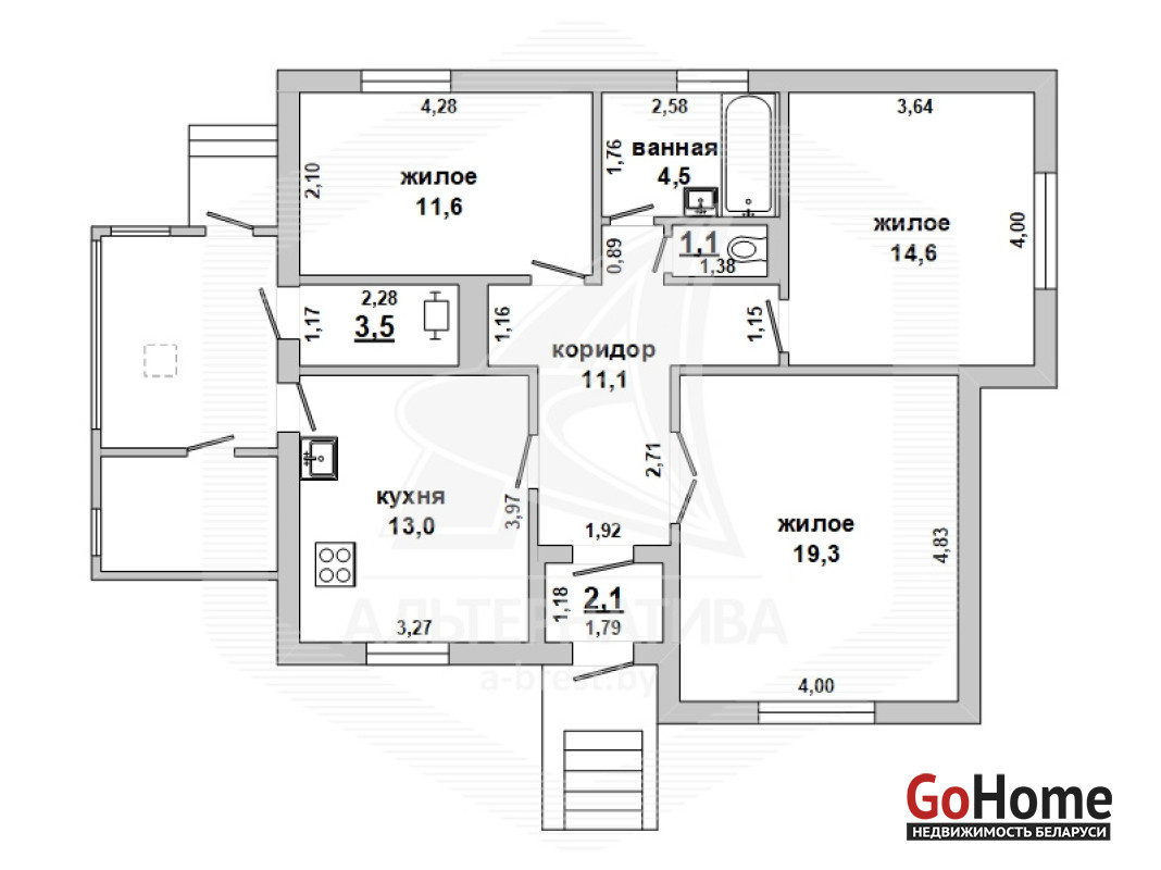 Жилой дом в Брестском р-не. 1992 г.п. 1 этаж. Общ.СНБ - 91,5 кв.м, общ.- 79,8 кв.м, жил.- 45,5 кв.м, кух.- 13,0 кв.м. 3 комнаты, высота потолка - 2,50 м.
