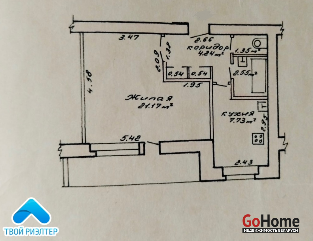 Площадь по СНБ 38,12 кв.м., жилая 21,17 кв.м., кухня 7.73 кв.м. Раздельный санузел. Без перепланировок.