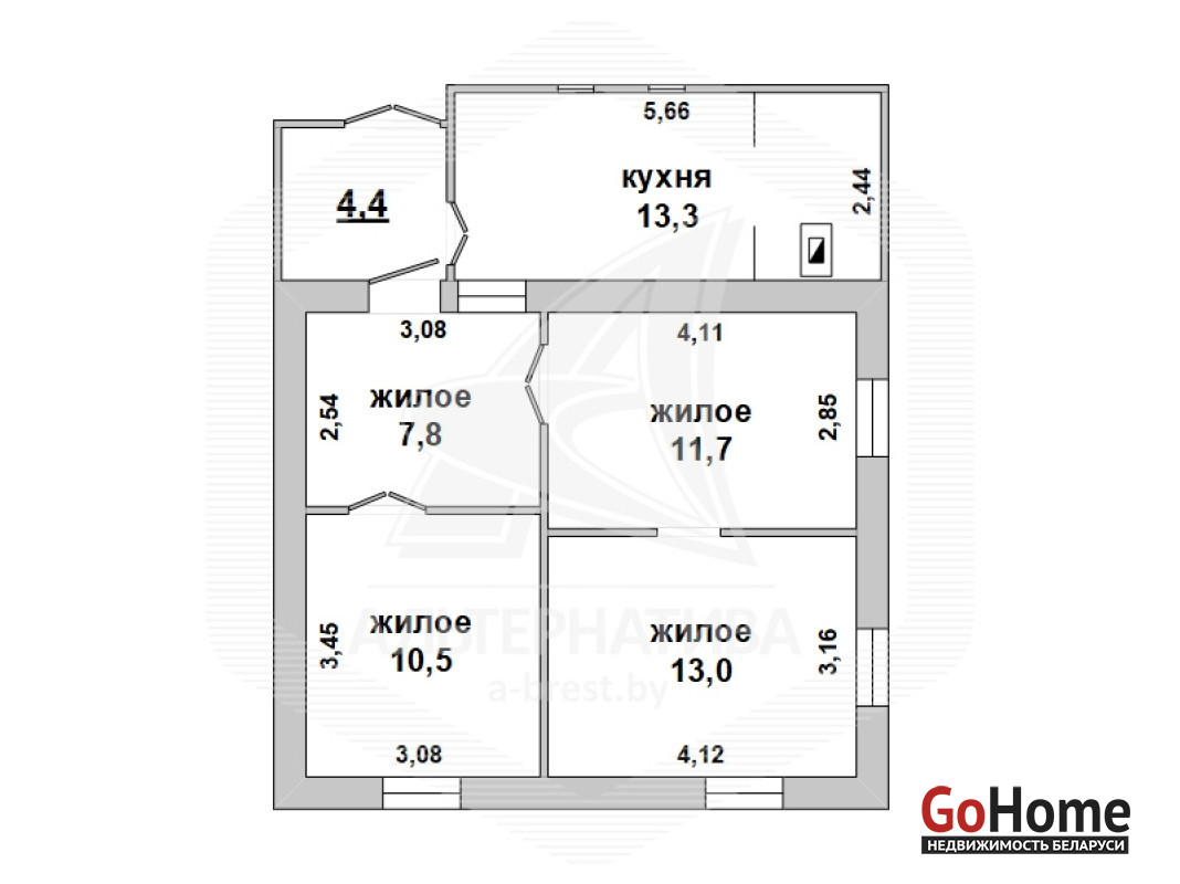 Жилой дом в г.Бресте. 1959 г.п. 1 этаж. Общ.СНБ - 60,7 кв.м, общ.- 56,3 кв.м, жил.- 43,0 кв.м, кух.- 13,3 кв.м. 4 комнаты, высота потолка - 2,80 м.
