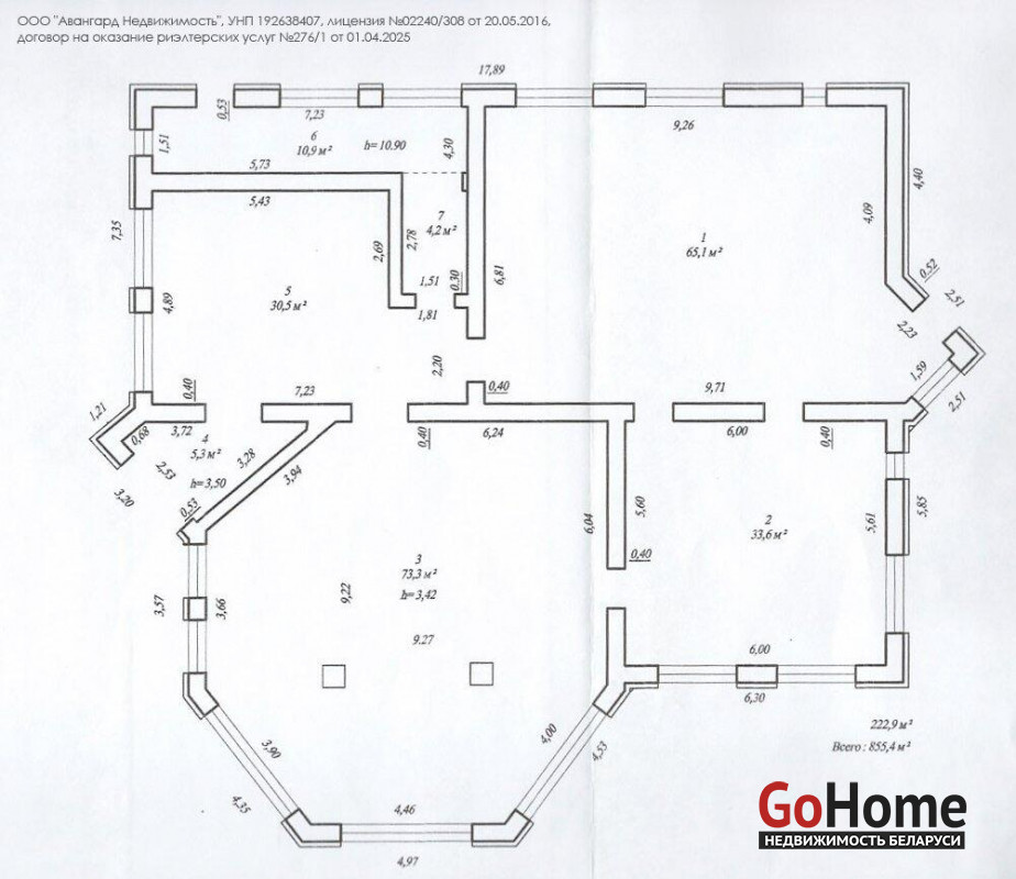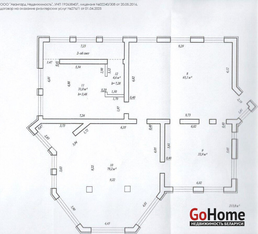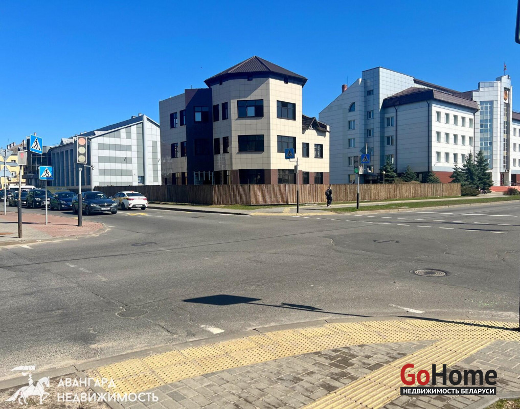 Первый этаж: два отдельных входа, просторный офисный зал, три кабинета, помещение под пост охраны, вспомогательные служебные помещения (тепловой пункт, э/щит, санузлы и т.п.).