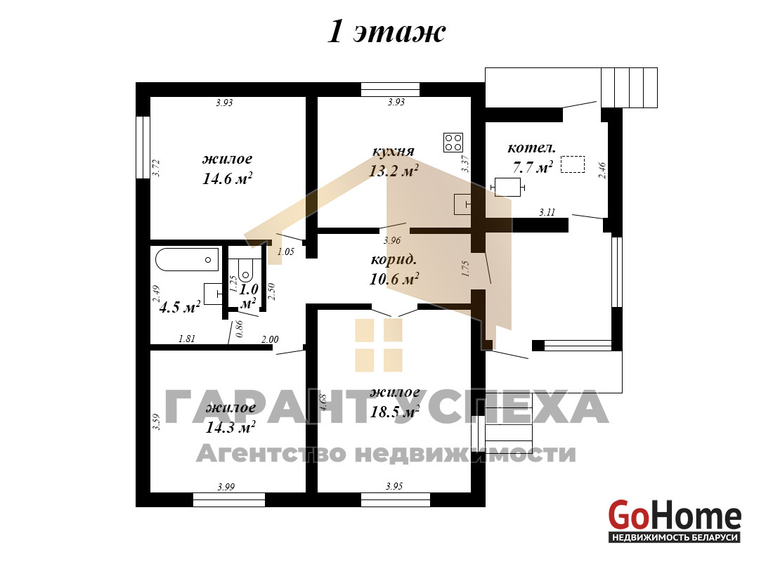 Общая площадь здания составляет 93,8 кв.м, жилая – 47,4 кв.м. В доме имеются: просторная кухня площадью, три жилых комнаты, раздельный санузел, коридор, котельная и веранда. Под строением имеется большое подвальное помещение. Для увеличения площади предусмотрена возможность обустройства мансардного этажа. Через помещение котельной предусмотрен дополнительный выход на другую сторону дома.