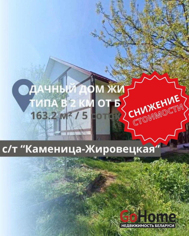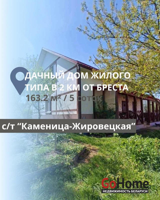 Продается дачный дом жилого типа, расположенный всего в 2 км от города, в Брестской области, Брестском районе, на территории садового товарищества Каменица-Жировецкая. Участок площадью 5 соток вмещает просторный блочный двухэтажный дом общей площадью 163,2 м2, построенный в 2012 году. На участке имеется скважина с электрическим насосом, подключено электричество, организовано отопление и местная канализация с септиком.
