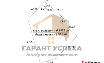 Земельный участок площадью 0,1485 Га находится в долевой собственности (доля в праве 179/500). Право собственности – аренда. На территории высажены многолетние плодовые деревья, кусты сирени.