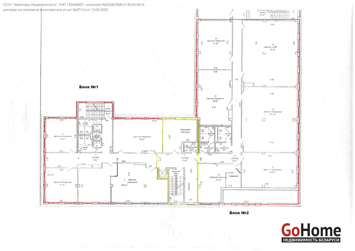 офисный блок №1 (в блоке 4 просторных кабинета, 2 раздельных санузла, душевая, есть пространство для зоны отдыха) - 340.4 кв. м; офисный блок №2 (в блоке 6 просторных кабинетов, 2 раздельных санузла, выделено помещение под серверную) - 576,8 кв. м; весь этаж общей площадью 917,2 кв. м (включает в себя 2 блока, ресепшн зону, помещение под кухню, вспомогательное помещение). Инфраструктура: