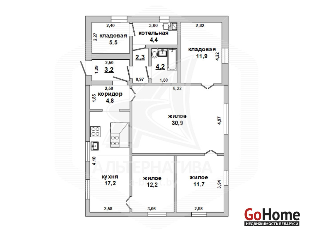 Жилой дом в Брестском р-не. 1961 г.п. 1 этаж. Общ.СНБ - 108,2 кв.м, общ.- 108,2 кв.м, жил.- 54,8 кв.м, кух.- 17,24 кв.м. 3 комнаты, высота потолка - 2,57 м.